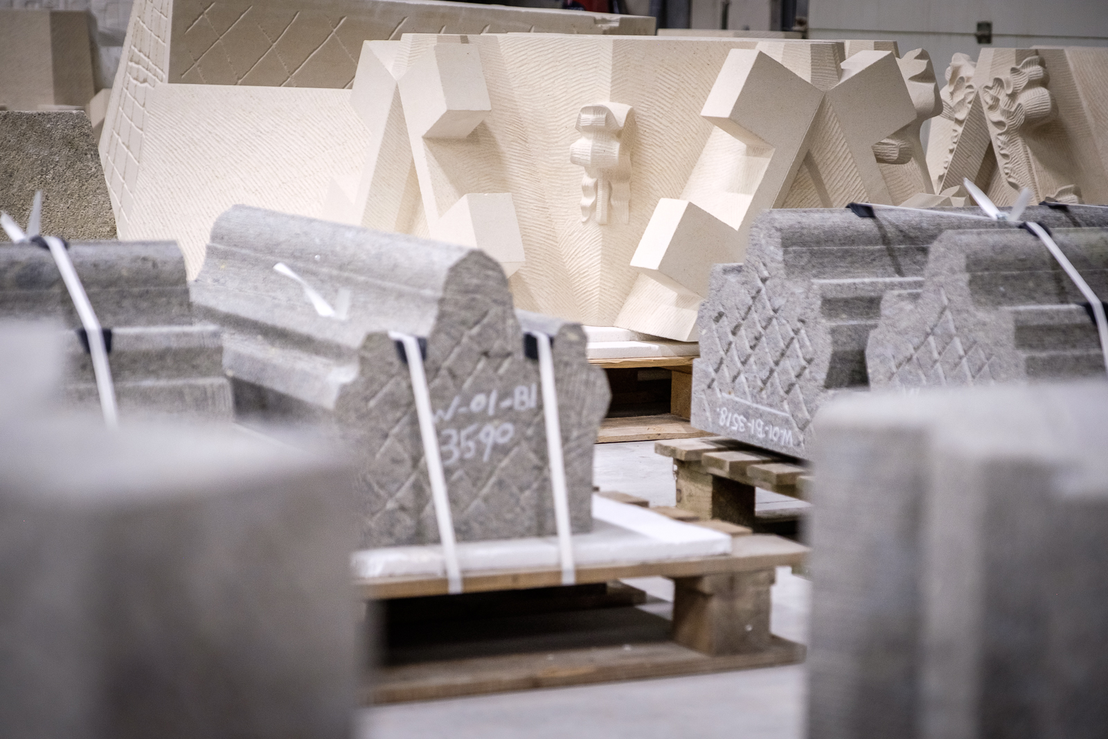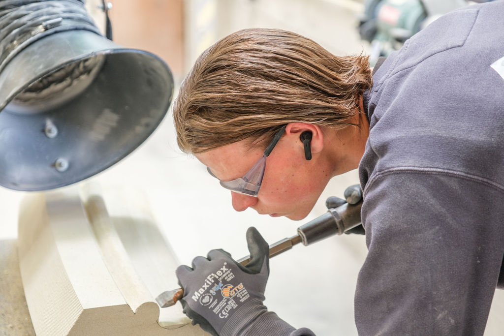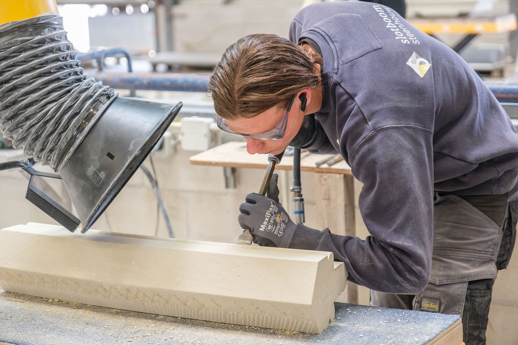 In zijn eerste jaar werkte Gerrit vooral aan de natuursteenrestauratie van de Domtoren in Utrecht. Trots vertelt hij over een kruisbloem waar hij aan mocht werken. Sinds de oplevering van de Domtoren, eind 2024, werkt hij ook aan diverse andere projecten zoals nu de Koninginnesluis in Nieuwegein. “Zo’n mooi historisch gebouw als de Domtoren zorgde er wel voor dat ik nog enthousiaster werd over het vak en over monumentale gebouwen.” vertelt Gerrit. Gerrit werkt niet alleen in de steenhouwerij. Hij gaat regelmatig mee naar een project op locatie. Dit is zowel leerzaam als een mooie afwisseling met het werken in de steenhouwerij. Hij houdt ervan om met pneumatisch gereedschap de natuursteenblokken te bewerken, en daarna de afwerking met de hand uit te voeren, tot de kleinste details.
